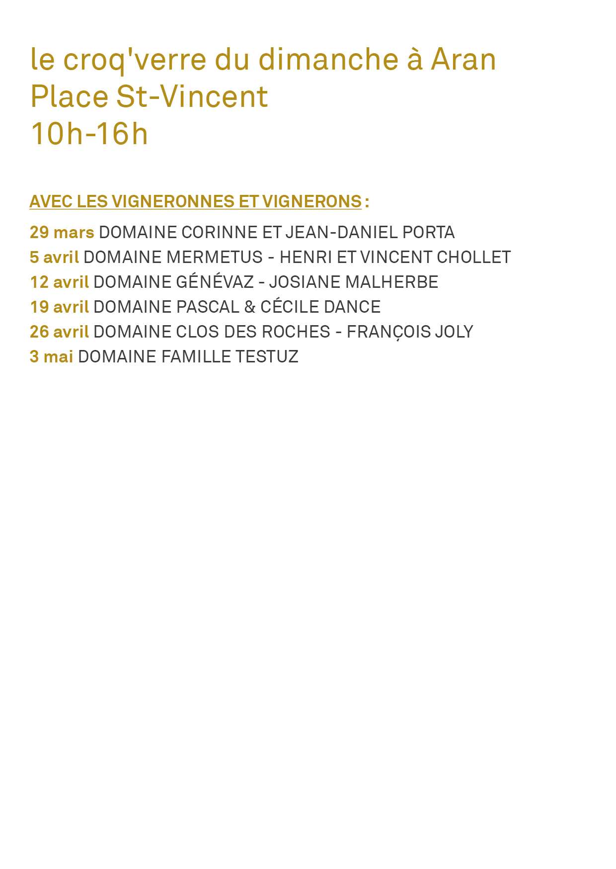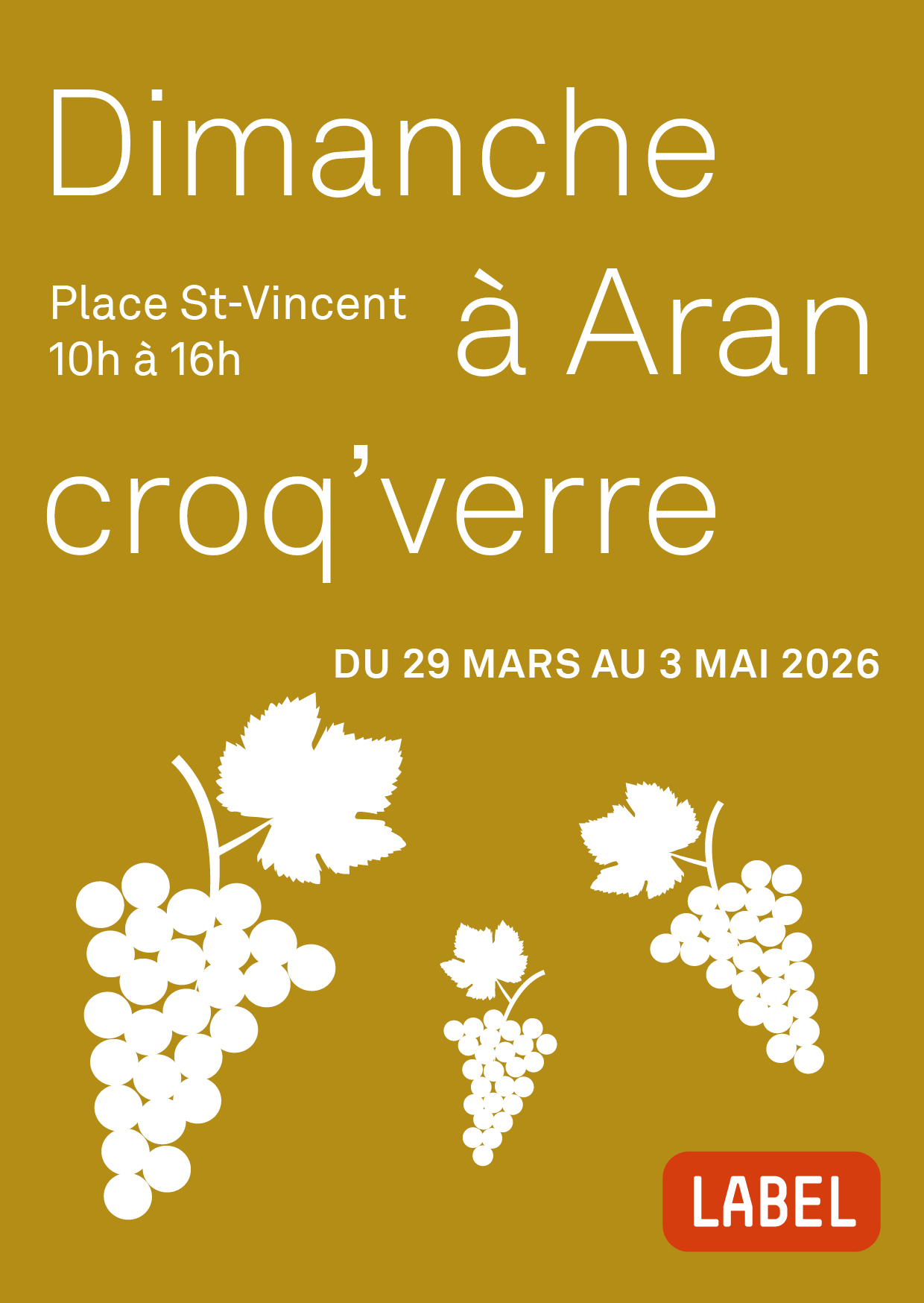 Les dimanches du 29 mars au 3 mai 2026, 10h-16h , Place St-Vincent à Aran.