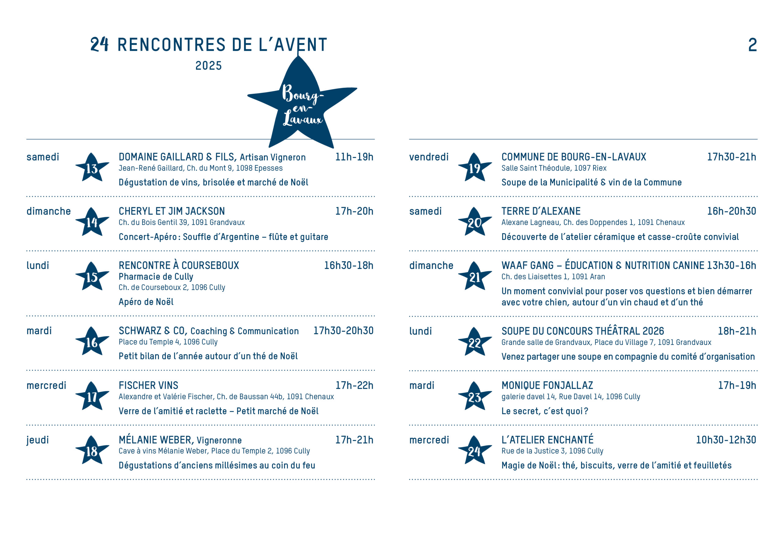 Ateliers, dégustations, concerts : tout un programme que nos hôtes de l’Avent proposent gracieusement afin de privilégier la rencontre au sens large. La commune de Bourg-en-Lavaux fête Noël dans ce cadre avec la traditionnelle soupe au pois.
